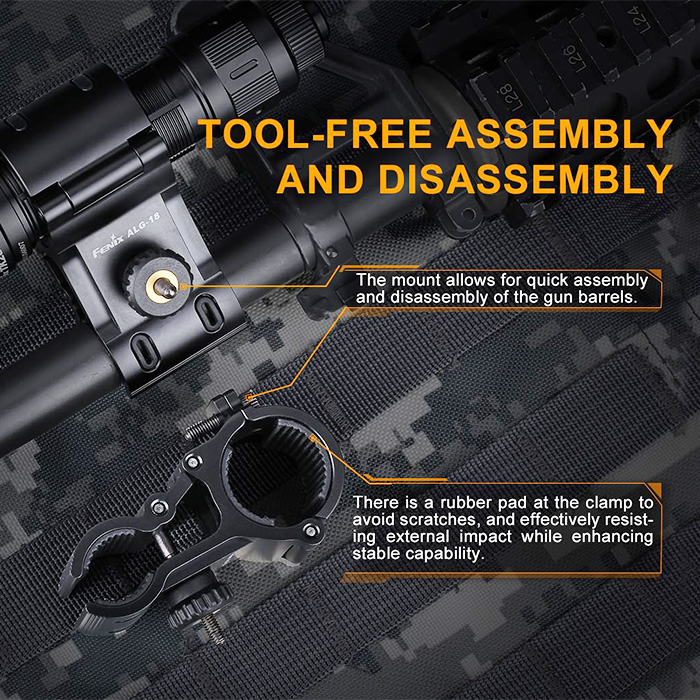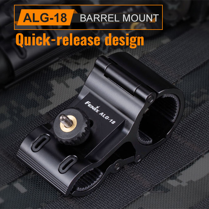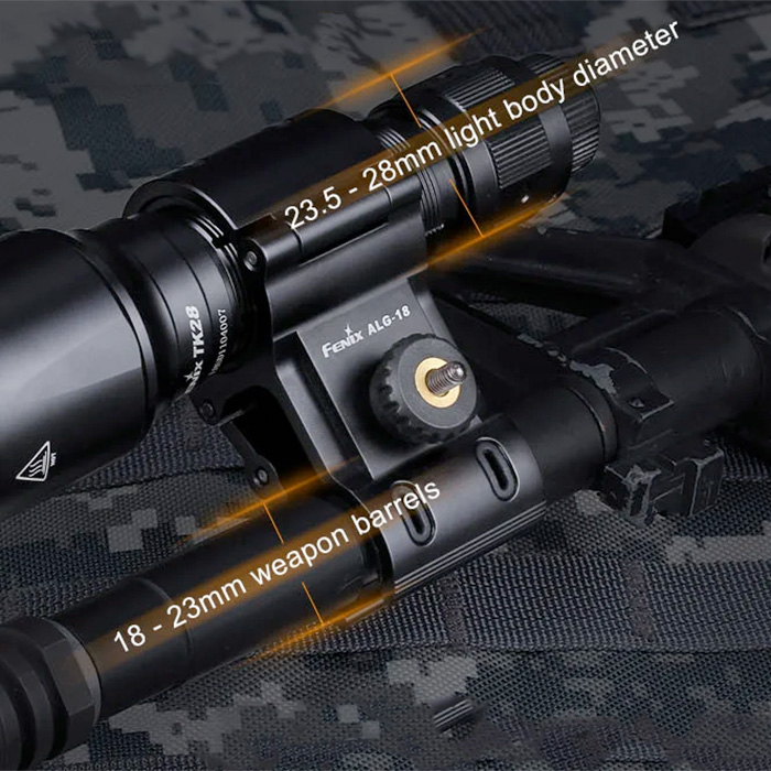 - What’s Included: Fenix ALG-18 flashlight mount (mounts to barrel); compatible with barrels from 18-22mm diameter; compatible with flashlights from 24-26mm barrel diameter and bezel diameter less than 70mm