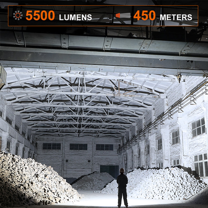 ☼ Spot + Flood high – 5500 lumens (50,624 candela), 4 hours, 450 meters