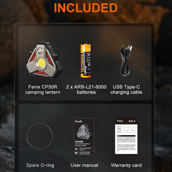 - What’s Included: Fenix CP50R lantern, 2 rechargeable batteries, USB-C to USB-A cable