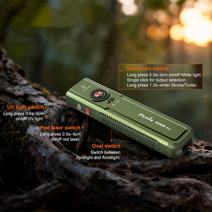 Fenix E06R Pro is a slim EDC rechargeable pocket flashlight with white, UV (ultraviolet) and red laser output modes. The E06R Pro has a main front switch and tail switch to activate white modes. A small oval front switch allows you to select spot mode or wide flood mode. Use the side switches to activate UV or red laser mode. This light has a USB-C charging port and a robust metal pocket clip……$74.95
