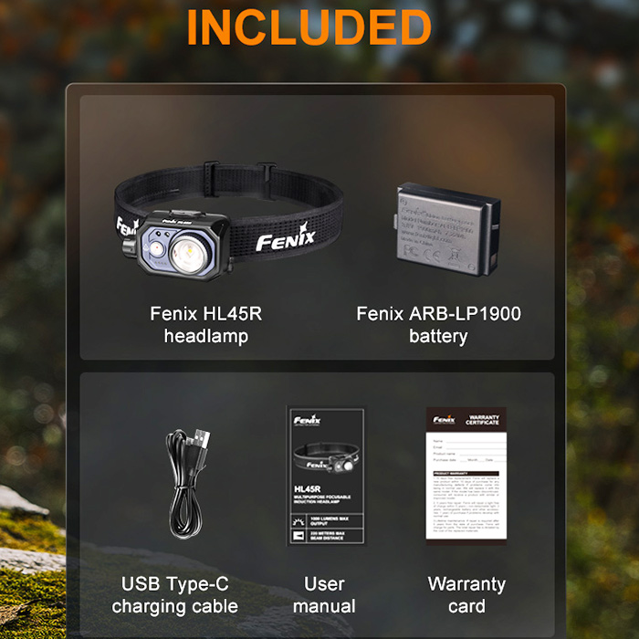 - What’s Included: Fenix HL45R headlamp with adjustable head strap, rechargeable battery and USB-C to USB-A charging cable