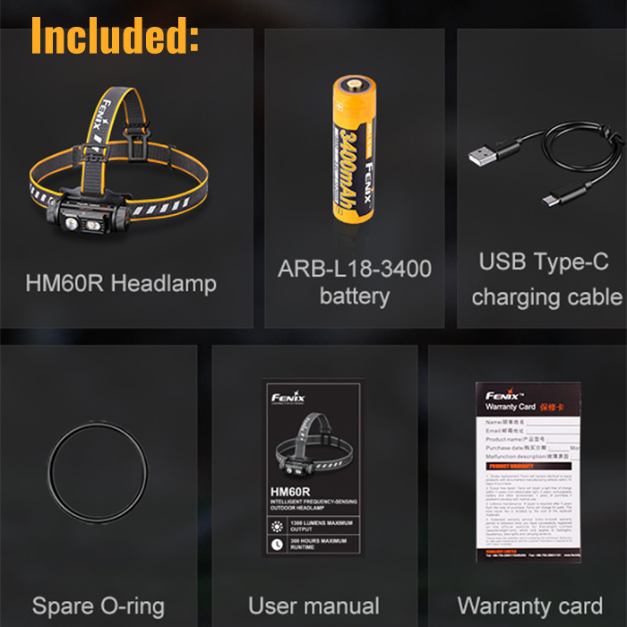- What’s Included: Fenix HM60R headlamp, rechargeable battery, adjustable head strap with top strap, USB-C cable, spare O-ring