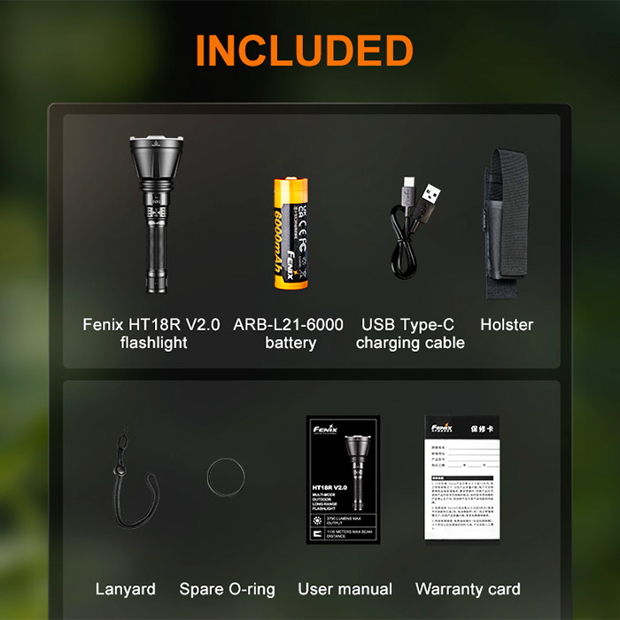 - What’s Included: Fenix HT18R V2.0 flashlight, battery, nylon belt holster, USB-C to USB-A cable, wrist lanyard, spare O-ring