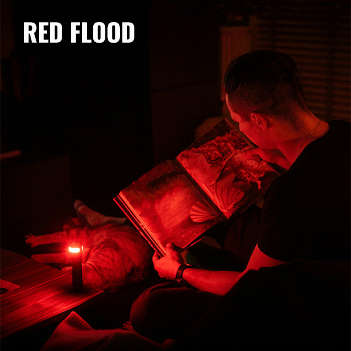 â–¹ rotate toggle to select white flood, white spot or red & blue mode