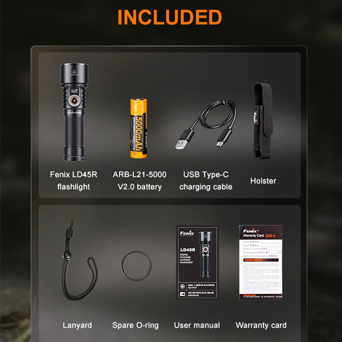 - What’s Included: Fenix LD45R, rechargeable battery, nylon holster, wrist lanyard, USB-C to USB-A cable