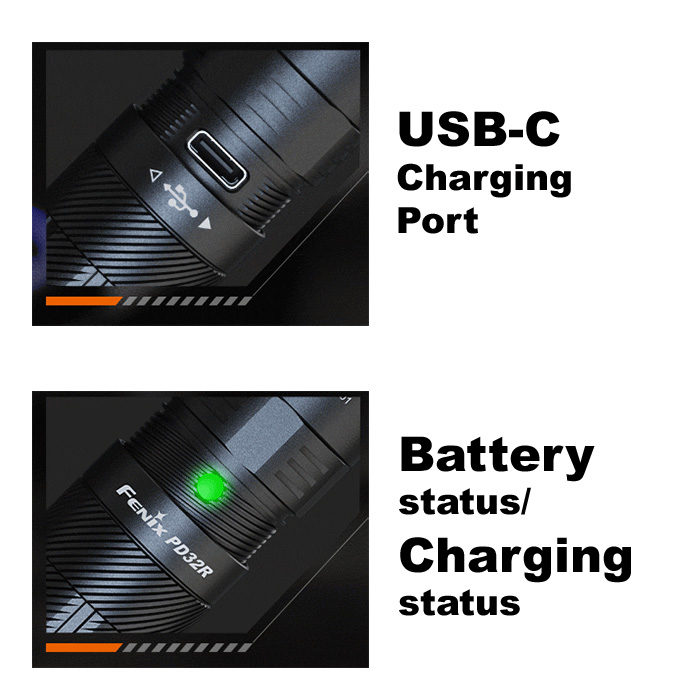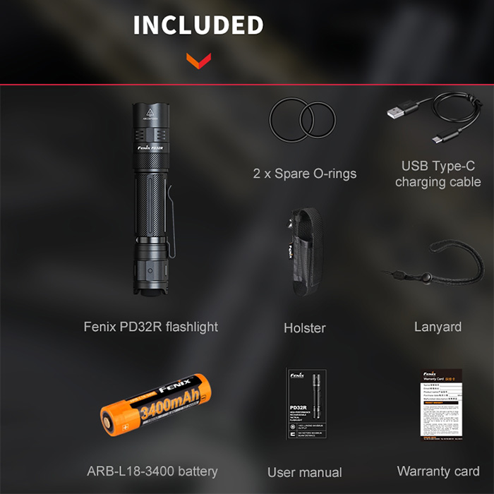- What’s Included: Fenix PD32R flashlight, rechargeable battery, USB-C cable, nylon belt holster, wrist lanyard, spare O-ring