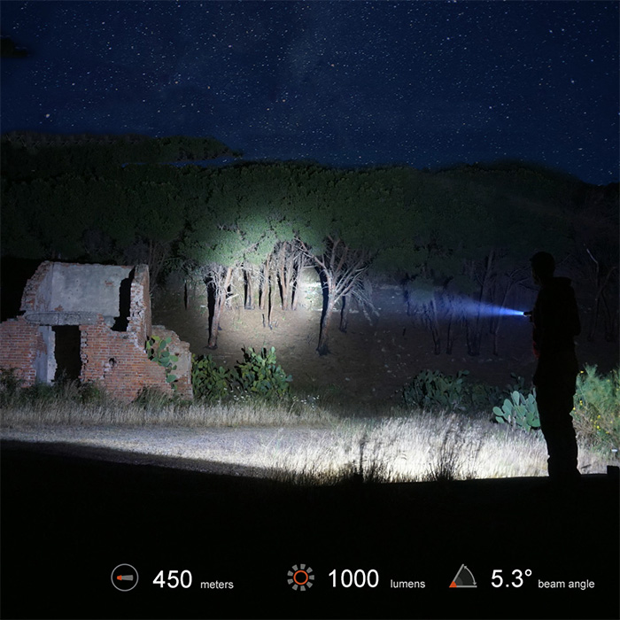 ☼ High – 1000 lumens, 0.8 hours, 450m