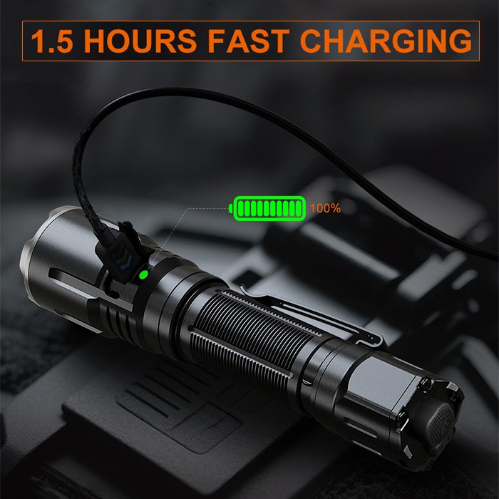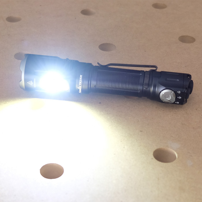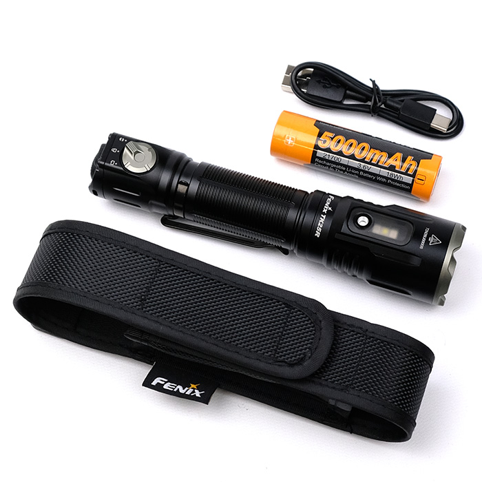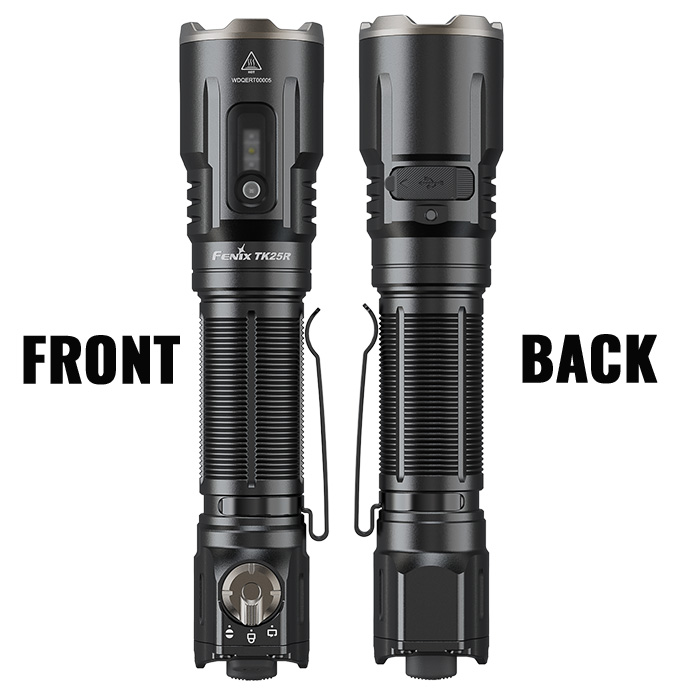 - What’s Included: Fenix TK25R, rechargeable battery, pocket clip, nylon holster, lanyard, USB-C to USB-A cable, spare O-ring