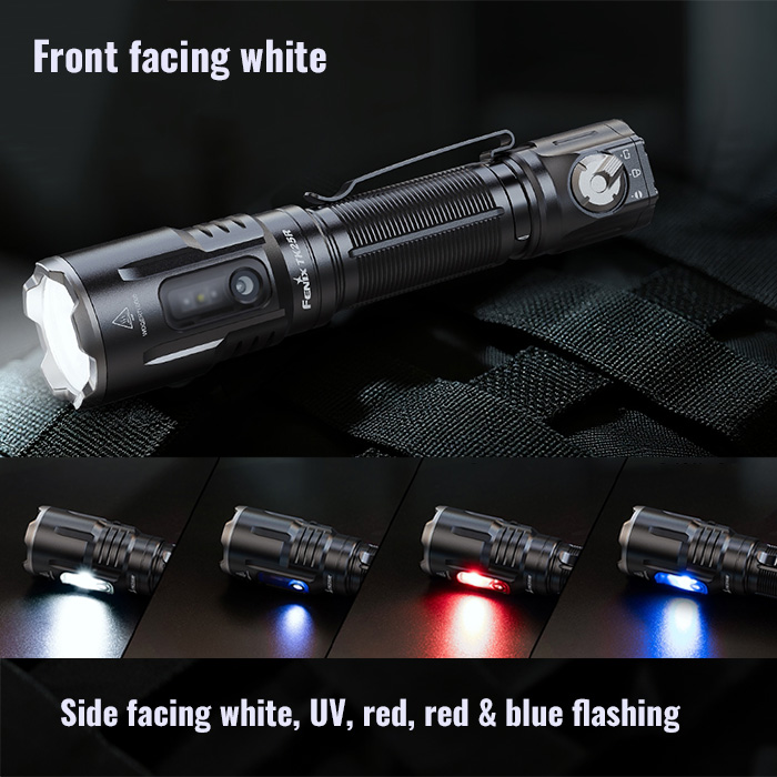 Fenix TK25R has front facing white output modes plus side facing lighting modes including white flood, low light red, UV (ultraviolelt), flashing red and flashing red & blue. TK25R is easy to operate with dual tail switches plus a rotary mode switch. This flashlight is USB-C rechargeable and includes a nylon belt holster and high capacity 5000mAh rechargeable battery……$139.95