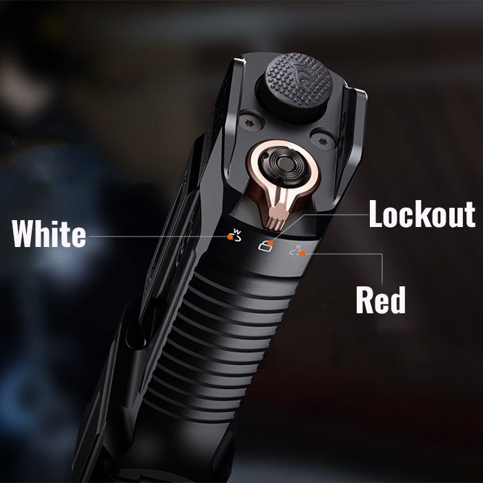 â–¹ rotate toggle switch on tail to select white, lockout or red mode