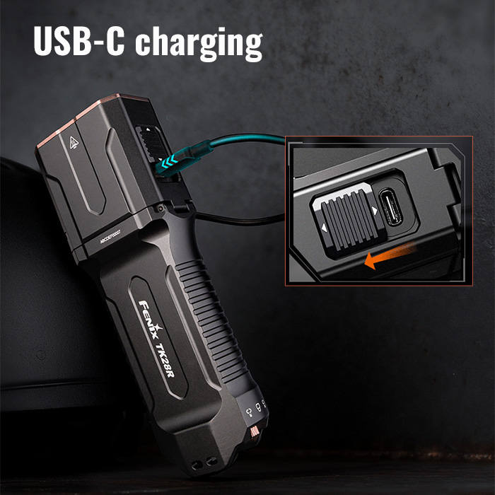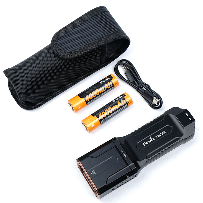- What’s Included: Fenix TK28R flashlight, two rechargeable batteries, nylon belt holster, pocket clip, wrist lanyard, spare O-ring and USB-C to USB-A cable