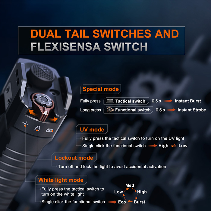 â–¹ rotate toggle mode switch on tail to select white output mode, lockout mode or UV (Ultraviolet) mode