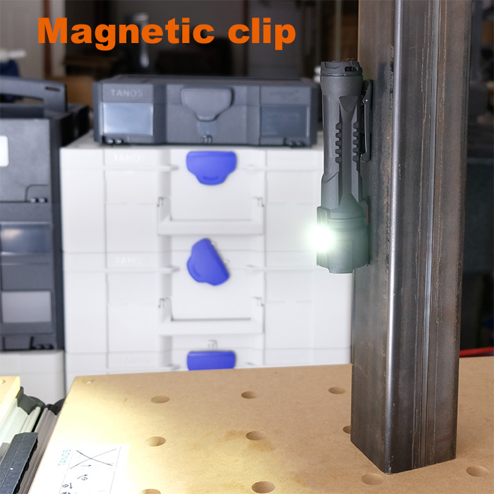 What’s included: KBS Innovations Razor Pro V2 flashlight, integrated clip with magnet, magnetic base, batteries