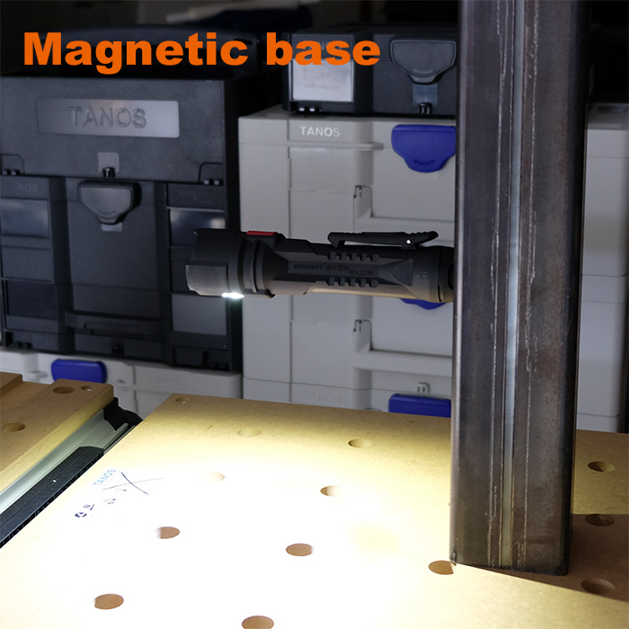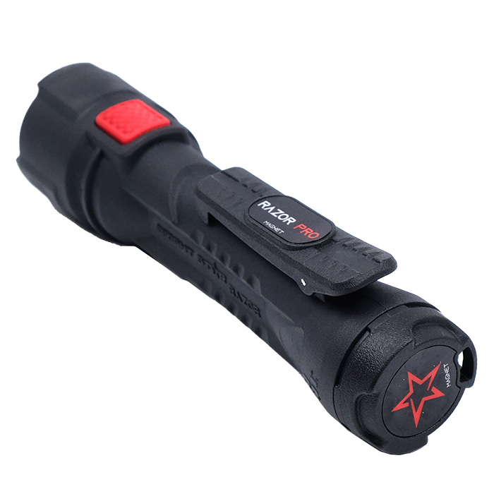 - What’s Included: KBS Innovations Razor Pro V2 flashlight, integrated clip with magnet, magnetic base, batteries