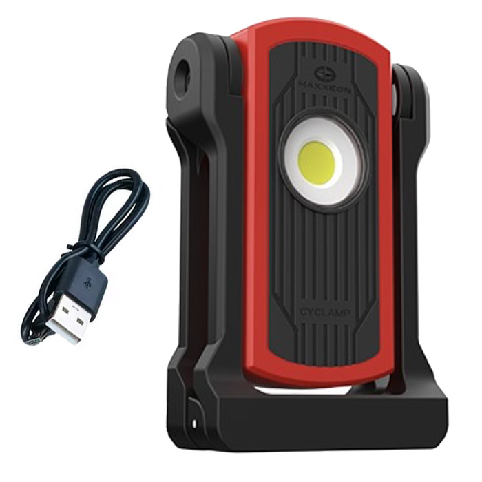 - What’s Included: Maxxeon WorkStar CYCLAMP light with built-in rechargeable battery, USB-C to USB-A charging cable