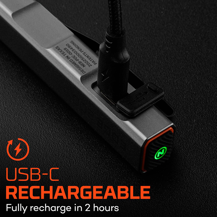 What’s included: NEBO Edge 800 with built-in rechargeable battery, pocket clip, USB-C to USB-A charging cable