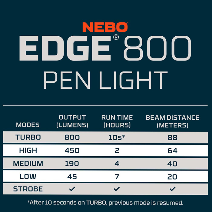 - What’s Included: NEBO Edge 800 with built-in rechargeable battery, pocket clip, USB-C to USB-A charging cable