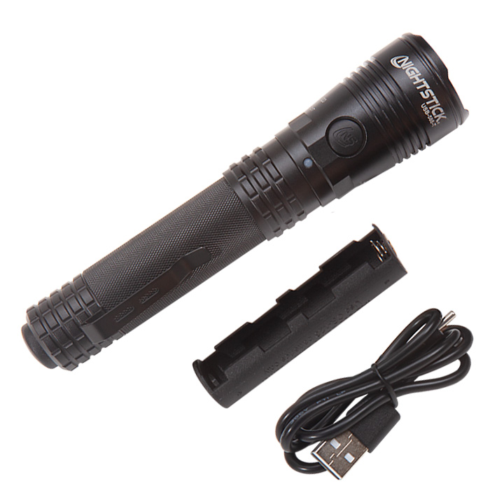 - What’s Included: Nightstick USB-588-T flashlight, rechargeable battery, pocket clip, USB-C to USB-A cable, CR123 battery carrier