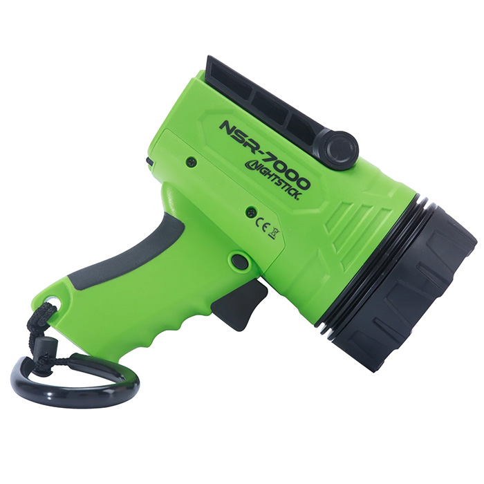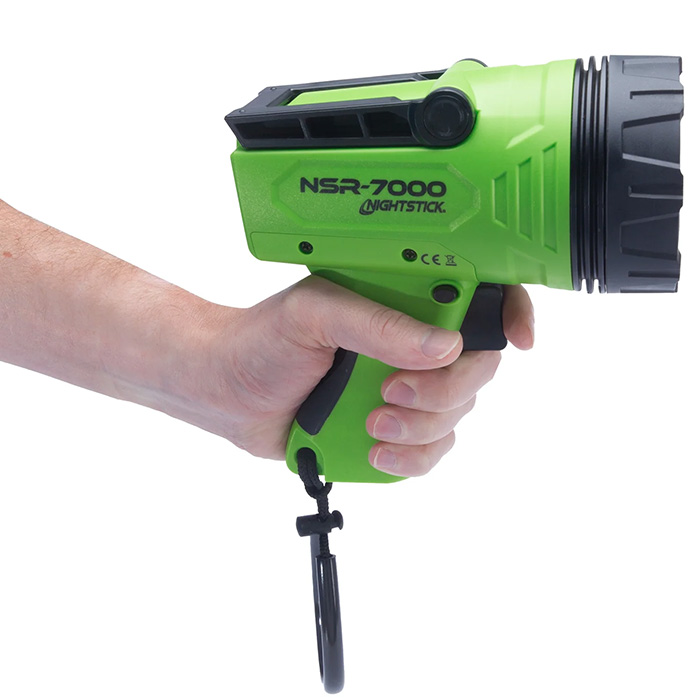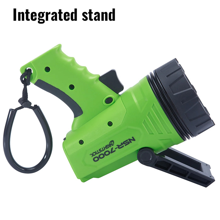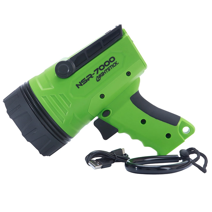 - What’s Included: Nightstick NSR-7000 spotlight with built-in rechargeable battery and integrated stand, USB-C to USB-A charging cable, wrist lanyard