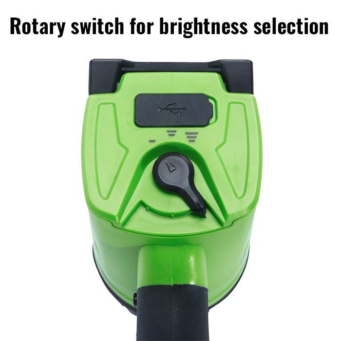 • trigger style switch for momentary or constant on/off; rotary switch to select brightness level