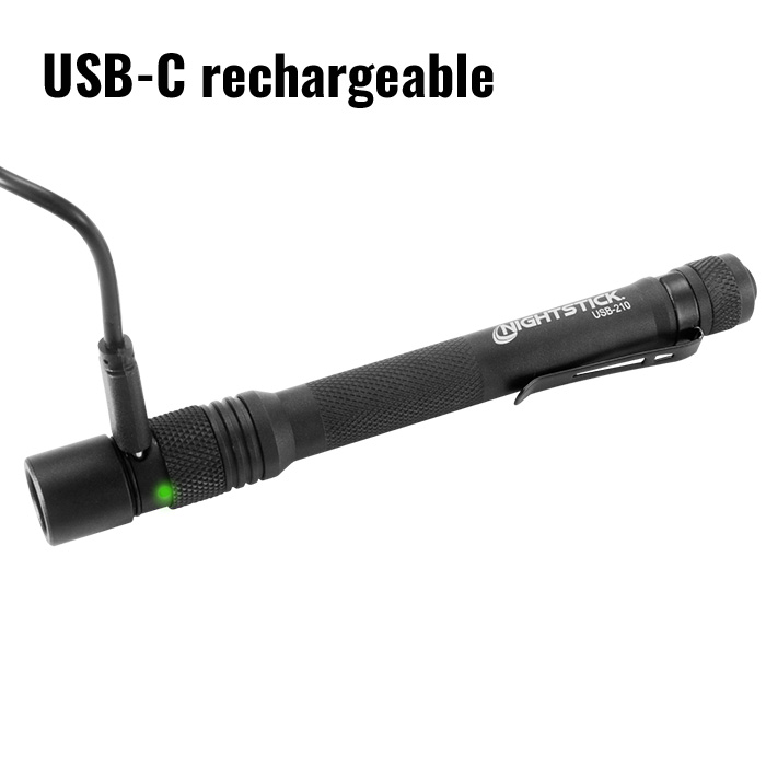- What’s Included: Nightstick USB-210 flashlight, rechargeable battery, pocket clip, USB-C to USB-A charging cable