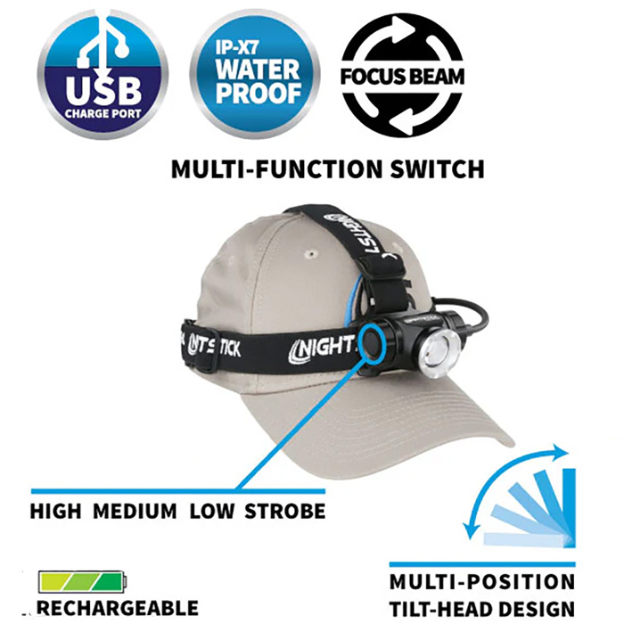 - What’s Included: Nightstick USB-4708B headlamp, adjustable head strap with non-slip lining, rechargeable battery, USB-C to USB-A charging cable