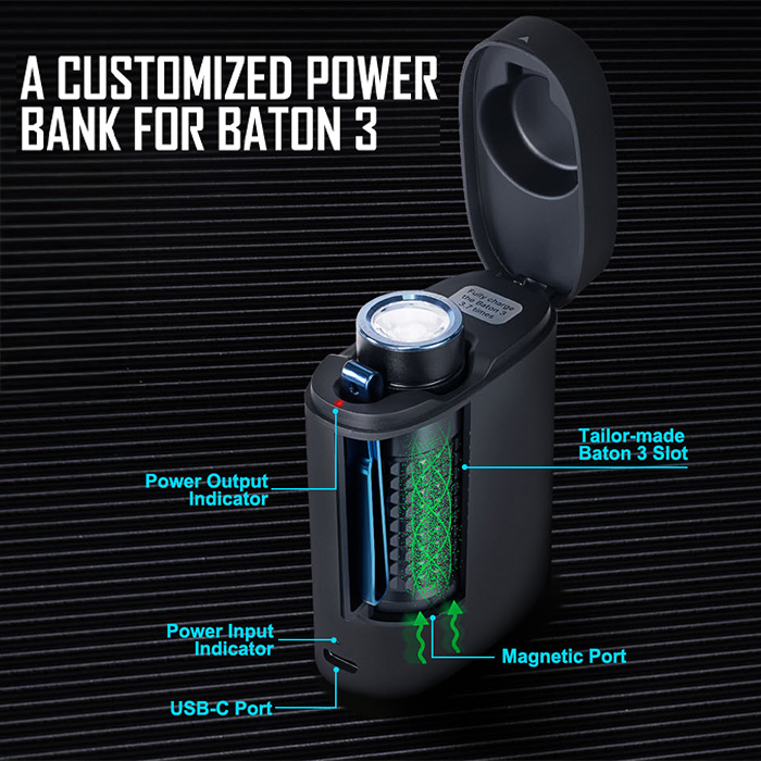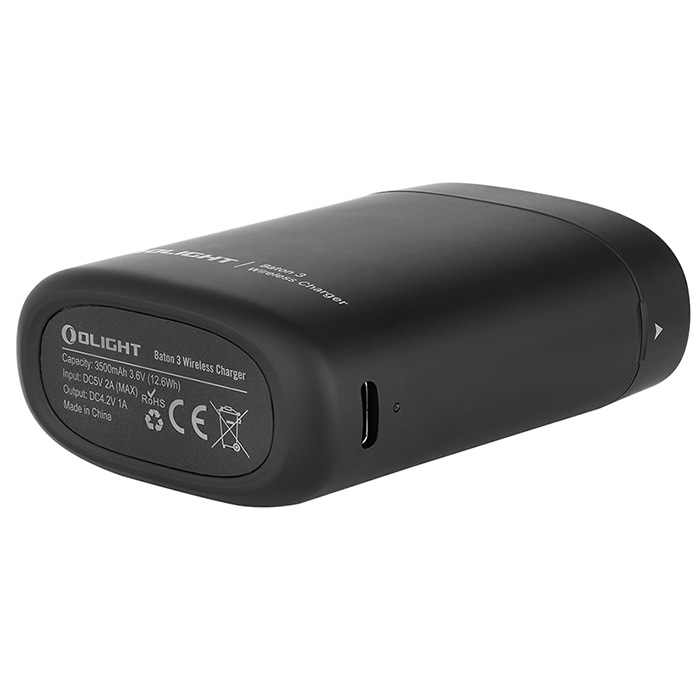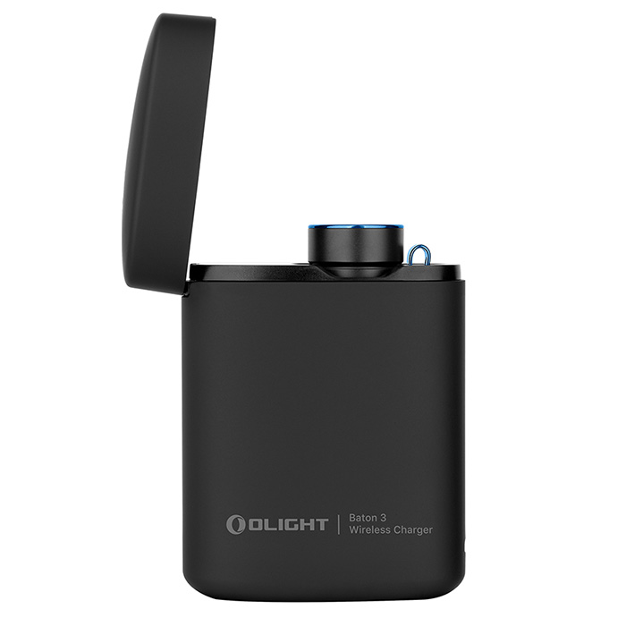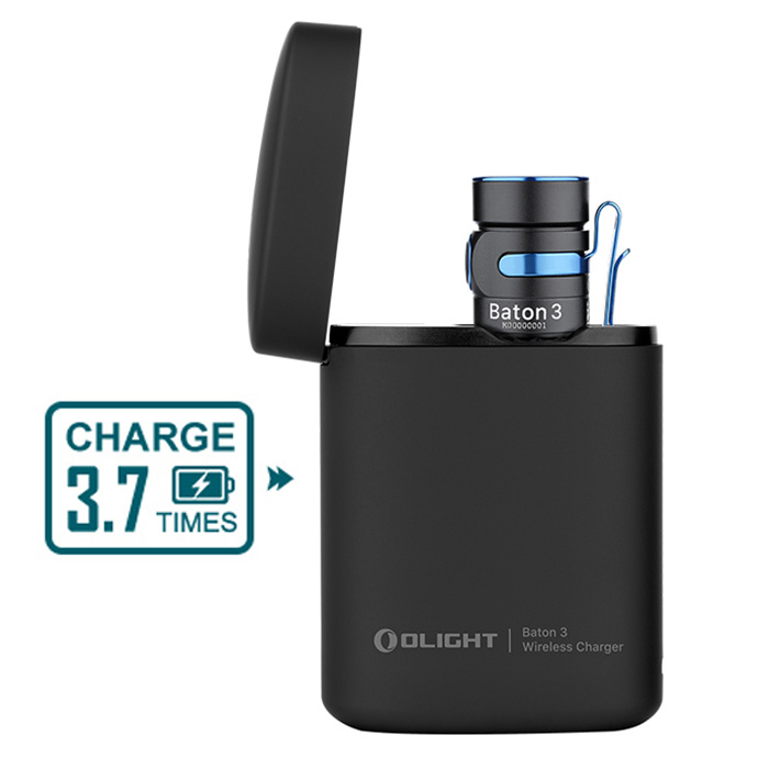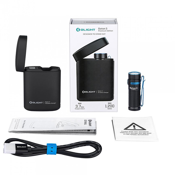 • What’s Included: Olight Baton 3 flashlight with battery and clip, wireless charger with built-in battery, USB-C to USB-A charging cable