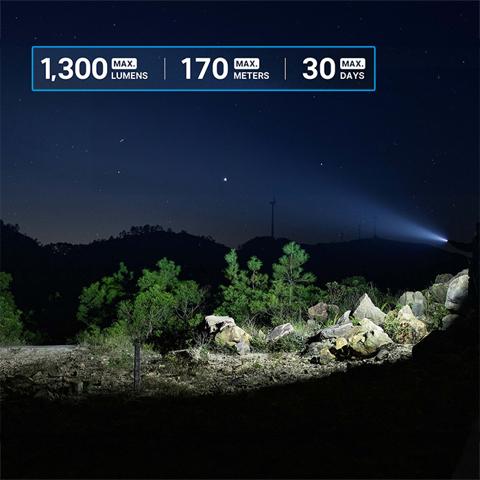 ☼ Turbo – 1300 lumens, 1.5 minutes; 600 lumens, 2.5 minutes; 300 lumens, 73 minutes; 170 meters