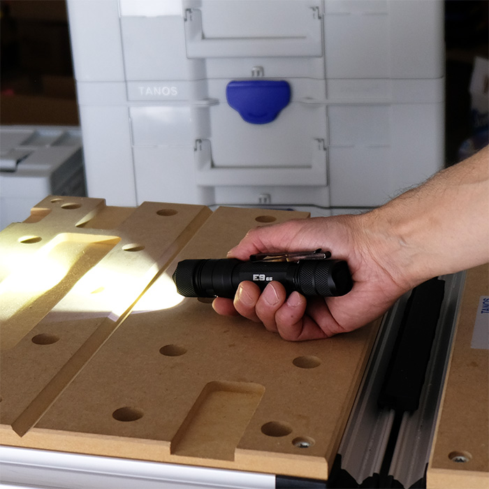 What’s included: Powertac E9 Gen 5 flashlight, rechargeable battery, pocket clip, magnetic charging cable, wrist lanyard, split rings, spare O-ring, spare charge port cover and nylon holster with velcro closure