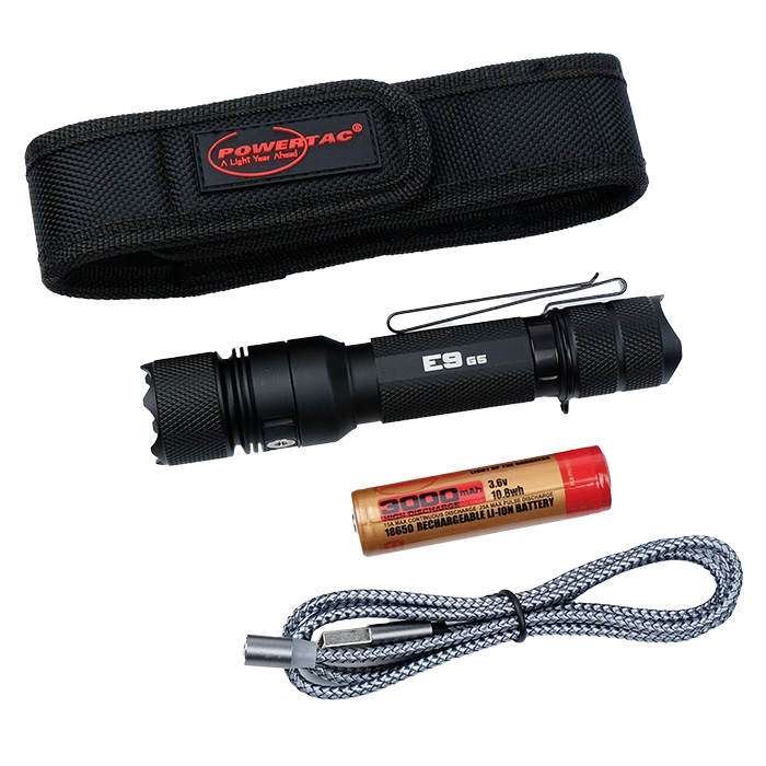 - What’s Included: Powertac E9 Gen5 flashlight, rechargeable battery, pocket clip, magnetic charging cable, wrist lanyard, split rings, spare O-ring, spare charge port cover and nylon holster with velcro closure