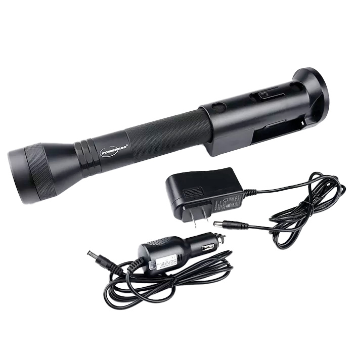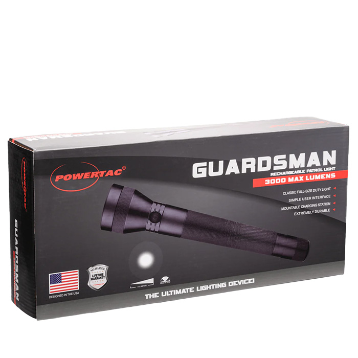 - What’s Included: Powertac Guardsman flashlight, rechargeable battery, charging base, AC-home and DC-car charge cords, spare O-ring