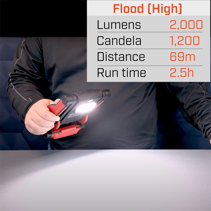 ☼ High flood – 2000 lumens, 2.5 hours, 69m