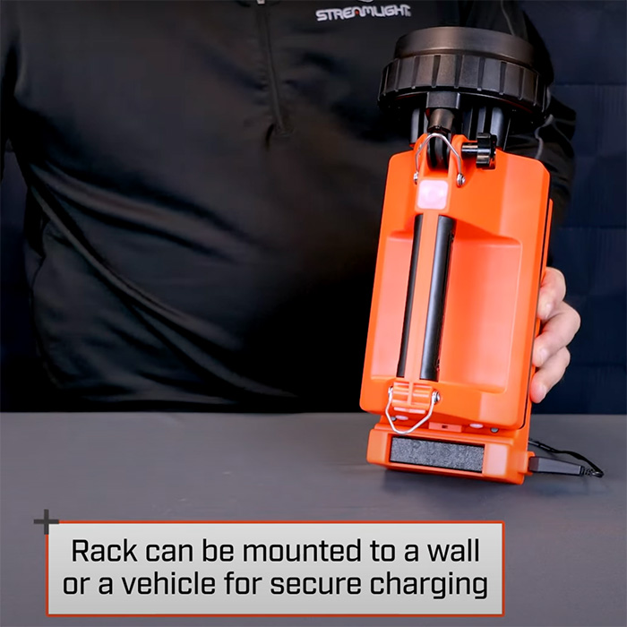 â–¹ slide light into LiteBox/FireBox charging rack for charging or attach Streamlight charge cord directly to light for charging (2-prong charge port on rear of light)