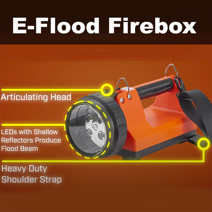 - What’s Included: Streamlight E-Flood FireBox, Li-ion rechargeable battery, shoulder strap and choice of charging options
