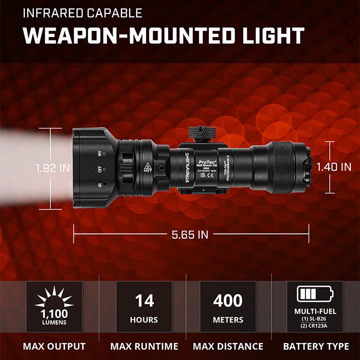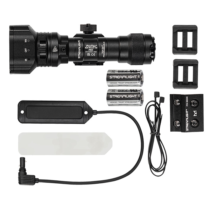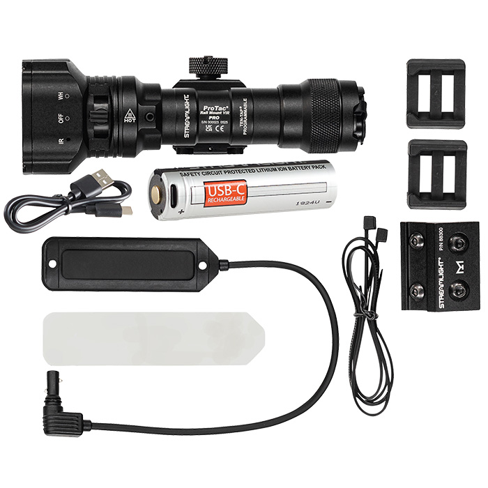 - What’s Included: Streamlight ProTac Rail Mount VIR Pro, remote pressure switch (momentary on only), remote retaining clips, M-LOK mount, mounting hardware; 88139 also includes SL-B26 rechargeable battery and USB-C to USB-A cable; 88138 also includes two CR123A non-rechargeable batteries