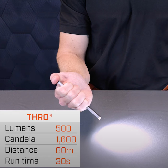 ☼ THRO – 500 lumens (1,600 candela), momentary burst of max brightness, 80 meters